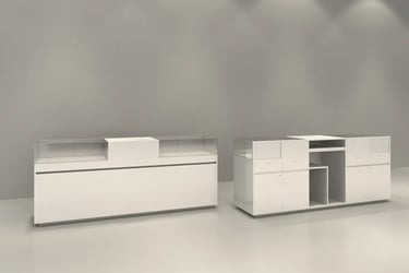 Secure, enclosed display units with optional glass fronts and internal lighting. Designed to protect high-value or delicate items, with locking mechanisms and customizable finishes to suit any brand aesthetic, not limited to jewelry or electronics.