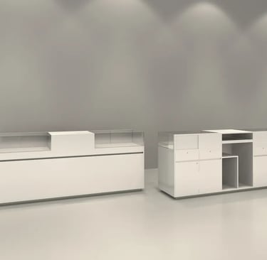 Custom-built service and checkout counters with integrated storage for POS systems, inventory, and customer supplies. Ergonomic designs and durable finishes create a professional front-of-store experience, independent of specific retail sectors.